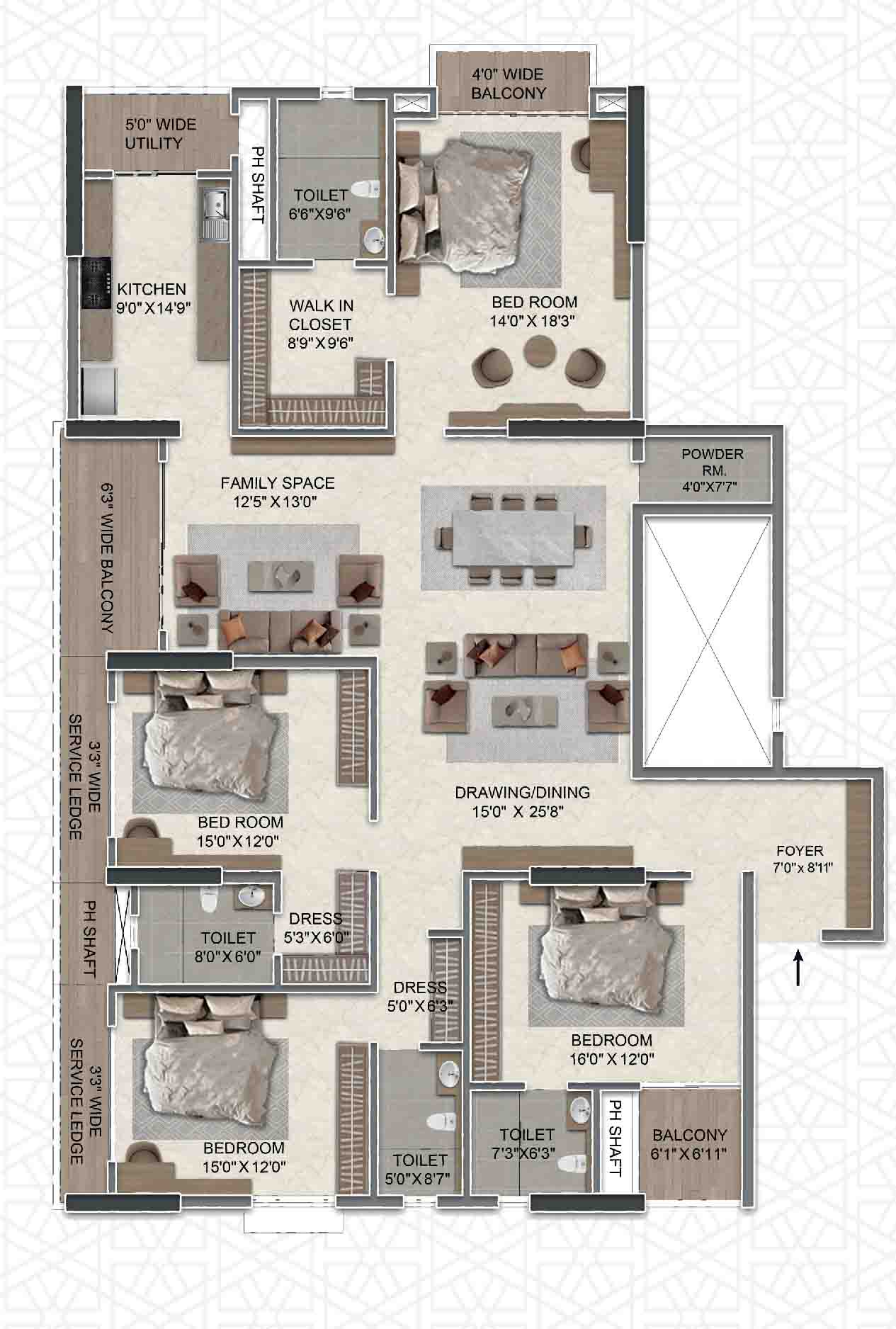 This residential flat is North-facing direction. Containing 4 bedroom(s), 4 bathrooms and 2 balconies, this flat is spread over a Super built up area of 3560 sq.ft. This flat is situated on the 7th floor of this 15 floors tall residential building. This residential flat is currently under construction and you can expect the possession of the same by December 2028.